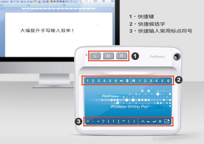 - 手写板书写区域设有多功能快选图纸,手写时只需点选即可选择候选字、快速输入常用标点符号与轻松换行,还可将您常用的键盘功能,设定在手写板上方的三个按键上,大幅提升手写输入效率 !